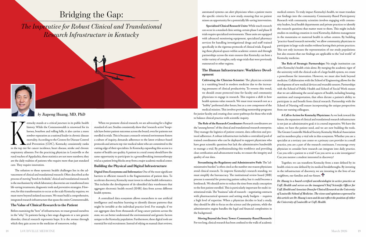 A Call to Action for Kentucky Physicians: As we look toward the future, the expansion of clinical and translational research infrastructure is not just an administrative goal; it is a moral imperative. We have the talent, we have the patient need, and we are now building the tools. The Greater Louisville Medical Society, Kentucky Medical Association and its members play a vital role in this ecosystem. Whether you are a specialist at a tertiary care center or a primary care provider in a small practice, you are a part of the research continuum. I encourage every physician to consider how research can integrate into daily practice. Can you refer a patient to a trial? Can you serve as a site investigator? Can you mentor a student interested in discovery?