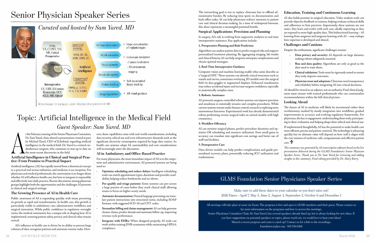 At the February meeting of the Senior Physicians Committee, Dr. Sam Yared, chair, shared a presentation created in part by Michael Yared, CEO of Echobind, regarding artificial intelligence in the medical field. Dr. Yared is a retired cardiothoracic surgeon, who continues to stay up to date on the most recent discoveries in the field.