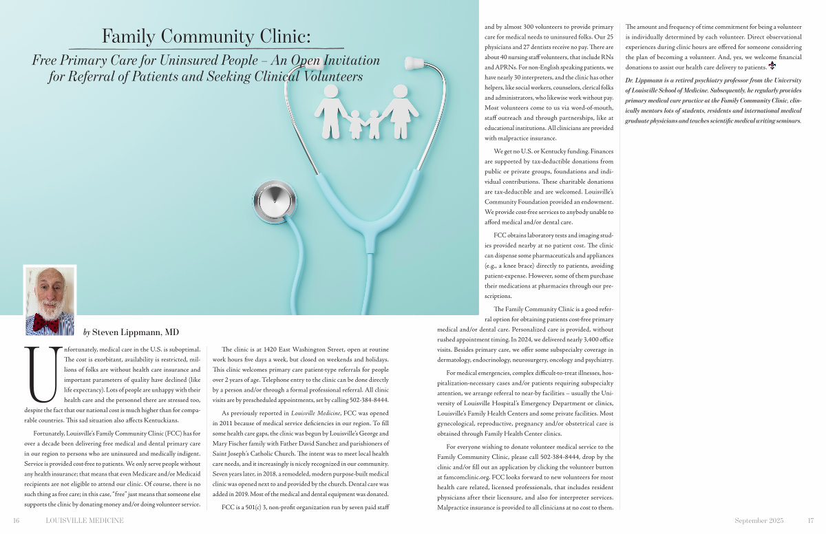 As previously reported in Louisville Medicine, FCC was opened in 2011 because of medical service deficiencies in our region. To fill some health care gaps, the clinic was begun by Louisville’ s George and Mary Fischer family with Father David Sanchez and parishioners of Saint Joseph’ s Catholic Church. The intent was to meet local health care needs, and it increasingly is nicely recognized in our community. Seven years later, in 2018, a remodeled, modern purpose-built medical clinic was opened next to and provided by the church. Dental care was added in 2019. Most of the medical and dental equipment was donated.