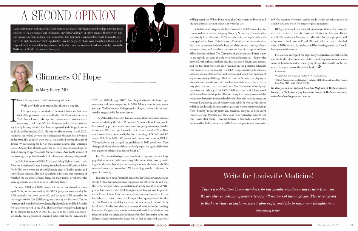 A Second Opinion welcomes the freely written articles of our diverse membership, whether these conform to the opinions of our publishers, our Editorial Board or other groups. However, we ask that opinions remain collegial and respectful. The Editorial Board and Oversight Committee reserve the right to choose what is published. We invite you to share your thoughts with us, and to respond to others, at editor @ glms. org. Publication does not represent endorsement by Louisville Medicine or GLMS. Let us hear from you!