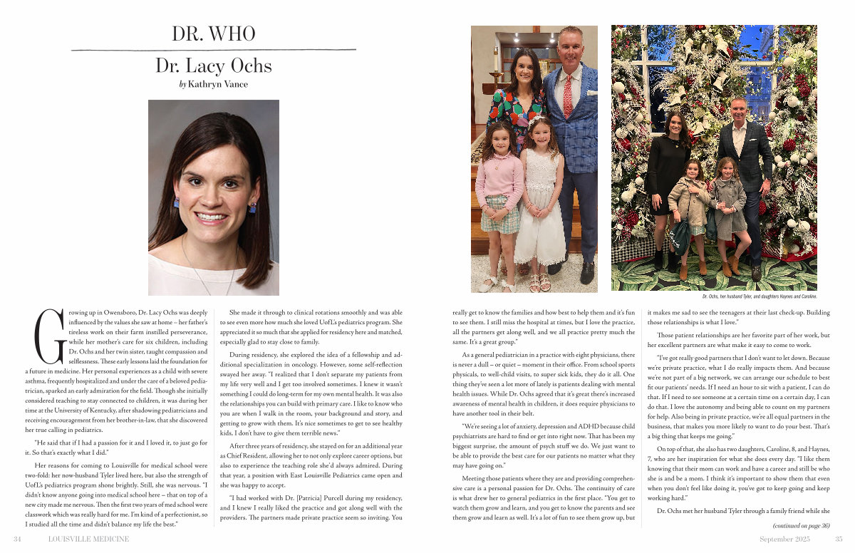 Growing up in Owensboro, Dr. Lacy Ochs was deeply influenced by the values she saw at home – her father’ s tireless work on their farm instilled perseverance, while her mother’ s care for six children, including Dr. Ochs and her twin sister, taught compassion and selflessness. These early lessons laid the foundation for a future in medicine. Her personal experiences as a child with severe asthma, frequently hospitalized and under the care of a beloved pediatrician, sparked an early admiration for the field. Though she initially considered teaching to stay connected to children, it was during her time at the University of Kentucky, after shadowing pediatricians and receiving encouragement from her brother-in-law, that she discovered her true calling in pediatrics.