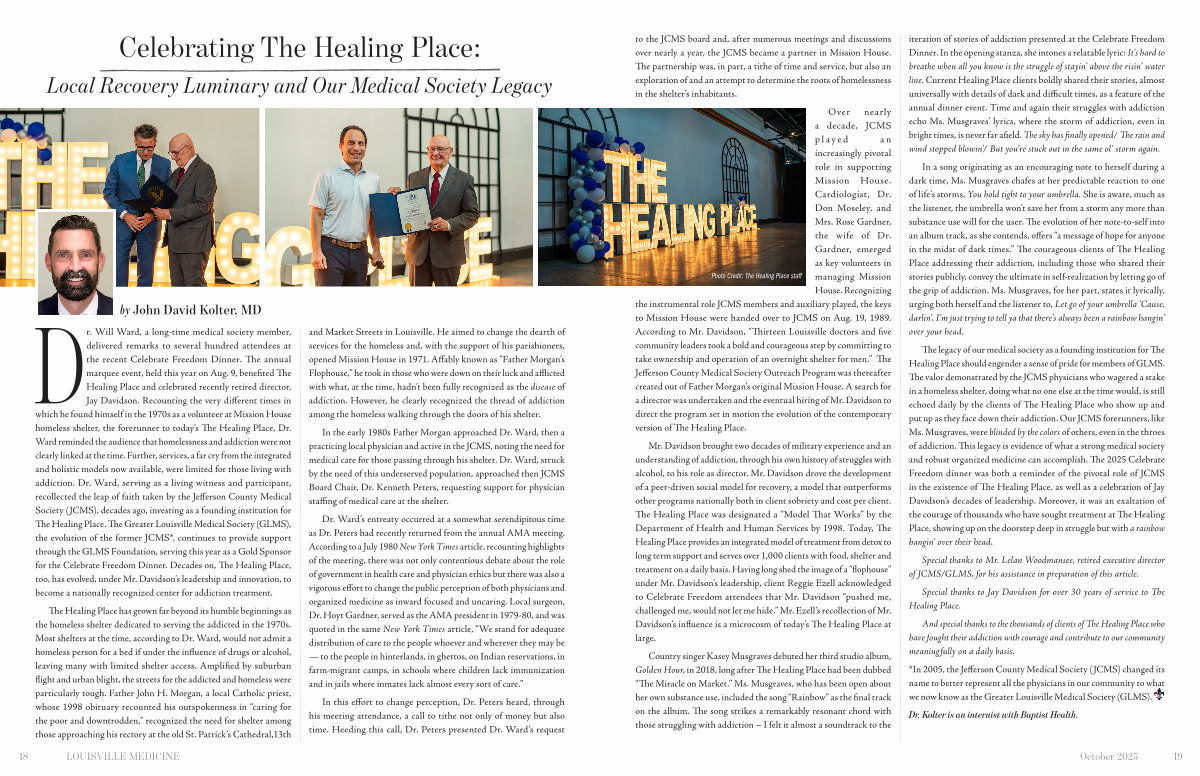 Dr. Will Ward, a long-time medical society member, delivered remarks to several hundred attendees at the recent Celebrate Freedom Dinner. The annual marquee event, held this year on Aug. 9, benefited The Healing Place and celebrated recently retired director, Jay Davidson. Recounting the very different times in which he found himself in the 1970s as a volunteer at Mission House homeless shelter, the forerunner to today’ s The Healing Place, Dr. Ward reminded the audience that homelessness and addiction were not clearly linked at the time. Further, services, a far cry from the integrated and holistic models now available, were limited for those living with addiction. Dr. Ward, serving as a living witness and participant, recollected the leap of faith taken by the Jefferson County Medical Society( JCMS), decades ago, investing as a founding institution for The Healing Place. The Greater Louisville Medical Society( GLMS), the evolution of the former JCMS *, continues to provide support through the GLMS Foundation, serving this year as a Gold Sponsor for the Celebrate Freedom Dinner. Decades on, The Healing Place, too, has evolved, under Mr. Davidson’ s leadership and innovation, to become a nationally recognized center for addiction treatment.