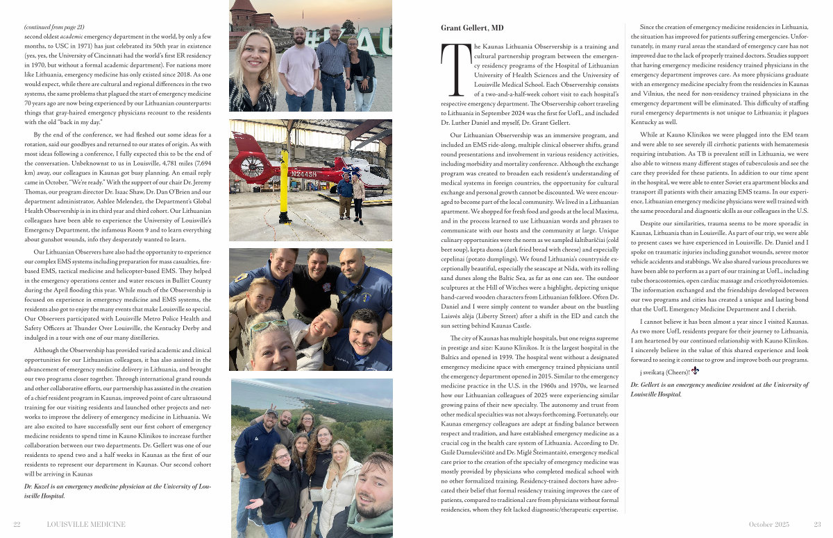 By the end of the conference, we had fleshed out some ideas for a rotation, said our goodbyes and returned to our states of origin. As with most ideas following a conference, I fully expected this to be the end of the conversation. Unbeknownst to us in Louisville, 4,781 miles( 7,694 km) away, our colleagues in Kaunas got busy planning. An email reply came in October,“ We’ re ready.” With the support of our chair Dr. Jeremy Thomas, our program director Dr. Isaac Shaw, Dr. Dan O’ Brien and our department administrator, Ashlee Melendez, the Department’ s Global Health Observership is in its third year and third cohort. Our Lithuanian colleagues have been able to experience the University of Louisville’ s Emergency Department, the infamous Room 9 and to learn everything about gunshot wounds, info they desperately wanted to learn.