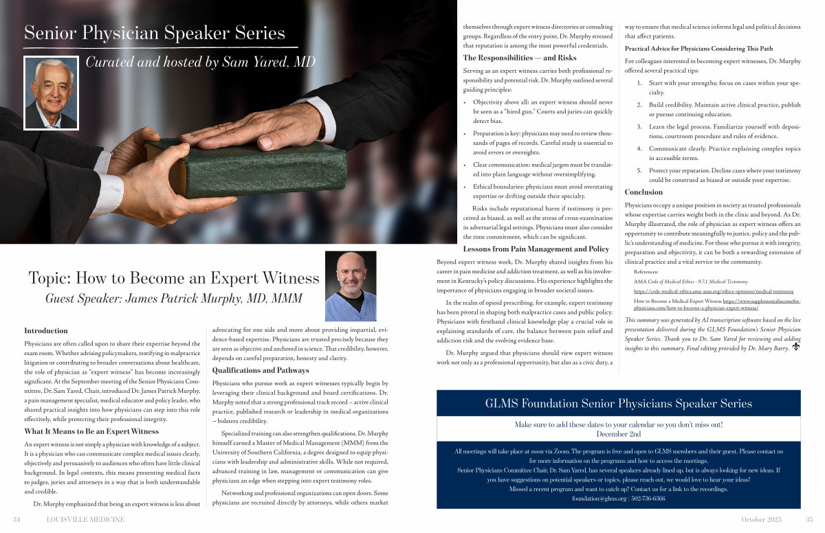 Physicians are often called upon to share their expertise beyond the exam room. Whether advising policymakers, testifying in malpractice litigation or contributing to broader conversations about healthcare, the role of physician as“ expert witness” has become increasingly significant. At the September meeting of the Senior Physicians Committee, Dr. Sam Yared, Chair, introduced Dr. James Patrick Murphy, a pain management specialist, medical educator and policy leader, who shared practical insights into how physicians can step into this role effectively, while protecting their professional integrity.