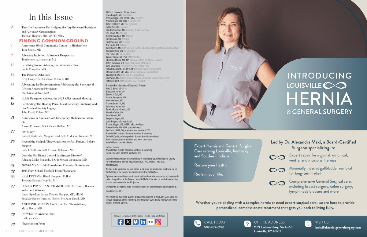 Opinions expressed herein are those of individual contributors and do not necessarily reflect the position of the Greater Louisville Medical Society. LM reminds readers this is not a peer reviewed scientific journal.