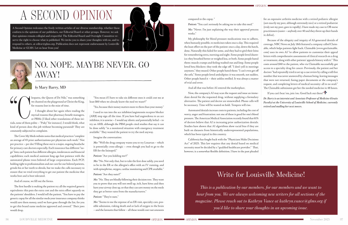 A Second Opinion welcomes the freely written articles of our diverse membership, whether these conform to the opinions of our publishers, our Editorial Board or other groups. However, we ask that opinions remain collegial and respectful. The Editorial Board and Oversight Committee reserve the right to choose what is published. We invite you to share your thoughts with us, and to respond to others, at editor @ glms. org. Publication does not represent endorsement by Louisville Medicine or GLMS. Let us hear from you!