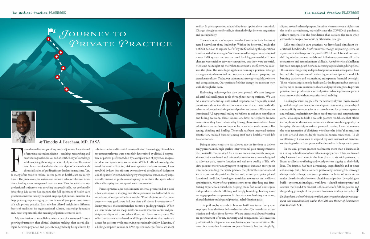 From the earliest stages of my medical journey, I envisioned a future in academic medicine— teaching, researching and contributing to the clinical and scientific body of knowledge while inspiring the next generation of physicians. The vision was clear: combine the intellectual rigor of academia with the satisfaction of guiding future leaders in medicine. Yet, as many of us come to realize, career paths in health care are rarely linear. The profession, the system and our own values evolve over time, often leading us to unexpected destinations. Two decades later, my professional trajectory was anything but predictable, yet profoundly rewarding. My career has spanned the full spectrum of health care practice: academic faculty, hospital-employed physician, member of a large private group, managing partner in a small group and now, owner of a solo private practice. Each role has offered insight into different facets of medicine: its organizational culture, leadership dynamics and, most importantly, the meaning of patient-centered care.