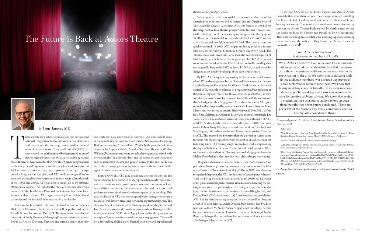 But now ATL is back!!! The much beloved version of Charles Dickens’ A Christmas Carol returns and will be performed in the Pamela Brown Auditorium Dec. 4-21. This new season is under the leadership of Emily Tarquin as Managing Director and Amelia Acosta Powell as Artistic Director. They are presenting a season that they anticipate will have something for everyone. This does include some of the community partners such as Kentucky Shakespeare Company, Redline Performing Arts and Faith Works. In the past, the selection of works by Eugene O’ Neill, Marsha Norman, Thornton Wilder, William Shakespeare and many notable playwrights, was mixed with new works, the“ Ten Minute Plays” and innovative theater techniques such as immersive theatre and gender issues. In the past, ATL was successful in bringing in large audiences because the focus was on the types of productions audiences wanted.