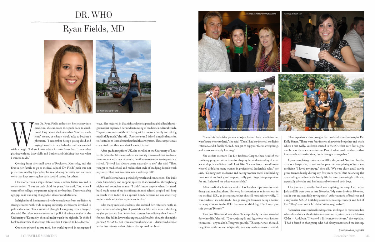 Coming from the small town of Rockport, Kentucky, and the first in her family to go to medical school, Dr. Fields’ path was not predetermined by legacy, but by an enduring curiosity and an inner voice that kept steering her back toward caring for others.