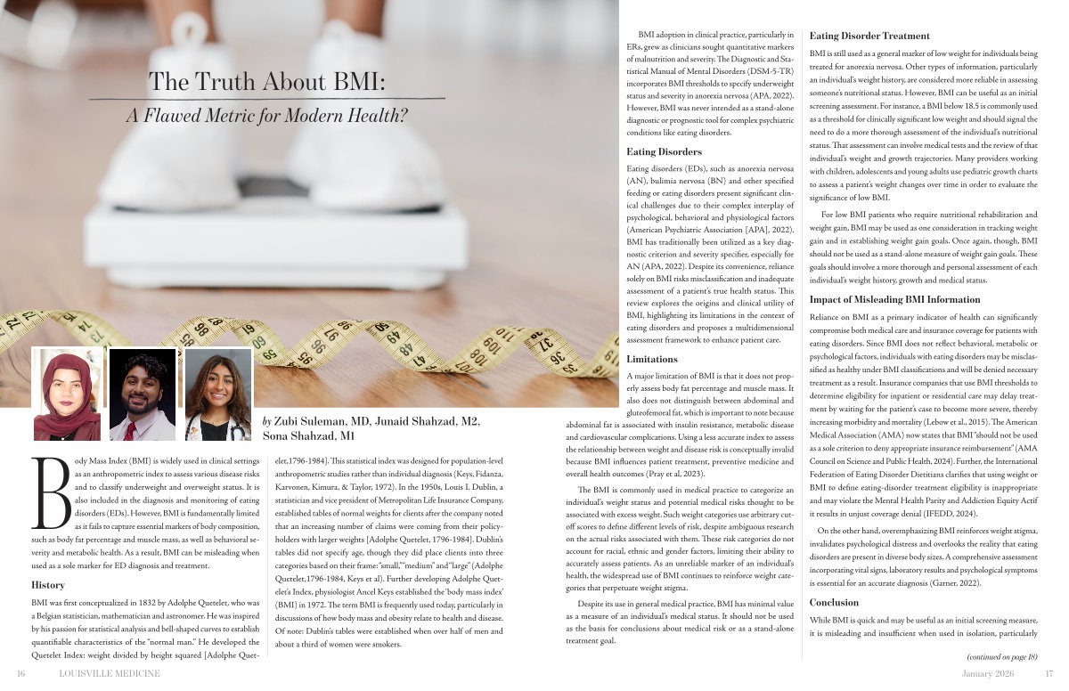 Body Mass Index( BMI) is widely used in clinical settings as an anthropometric index to assess various disease risks and to classify underweight and overweight status. It is also included in the diagnosis and monitoring of eating disorders( EDs). However, BMI is fundamentally limited as it fails to capture essential markers of body composition, such as body fat percentage and muscle mass, as well as behavioral severity and metabolic health. As a result, BMI can be misleading when used as a sole marker for ED diagnosis and treatment.