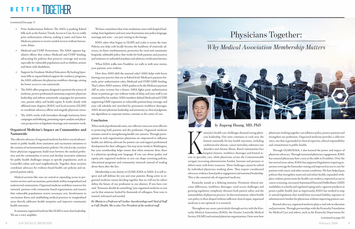 Throughout my career, particularly through service with the Kentucky Medical Association( KMA), the Greater Louisville Medical Society( GLMS) and national physician organizations, I have seen how physicians working together can influence policy, protect patients and strengthen our profession. Organized medicine provides a collective voice, one that is grounded in clinical expertise, ethical responsibility and commitment to public health.