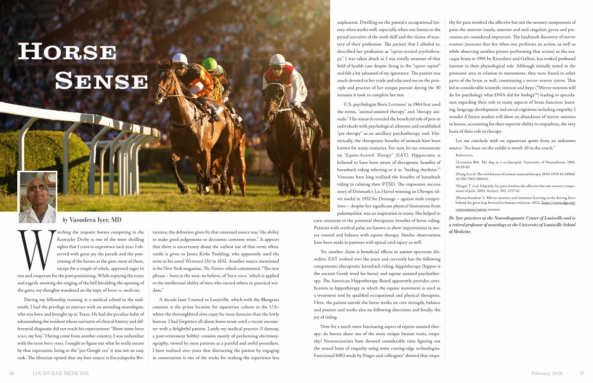 U. S. psychologist Boris Levinson 1 in 1964 first used the terms,“ animal-assisted therapy” and“ therapy animals.” His research revealed the beneficial role of pets in individuals with psychological ailments and established“ pet therapy” as an ancillary psychotherapy tool. Historically, the therapeutic benefits of animals have been known for many centuries. For now, let me concentrate on“ Equine-Assisted Therapy”( EAT). Hippocrates is believed to have been aware of therapeutic benefits of horseback riding referring to it as“ healing rhythms.” 2 Veterans have long realized the benefits of horseback riding in calming their PTSD. The impressive success story of Denmark’ s Lis Hartel winning an Olympic silver medal in 1952 for Dressage – against male competitors – despite her significant physical limitations from poliomyelitis, was an inspiration to many. She helped to turn attention to the potential therapeutic benefits of horse riding. Patients with cerebral palsy are known to show improvement in motor control and balance with equine therapy. Similar observations have been made in patients with spinal cord injury as well.