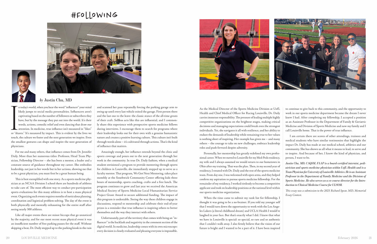 and scanned her pass repeatedly forcing the parking garage arm to swing up until every last vehicle exited the garage. First person there and the last one to the leave: the classic stance of the all-time greats of their craft. Selfless acts like this are influential, and I commonly share this experience with prospective sports medicine fellows during interviews. I encourage them to search for programs where their leadership looks out for their own with a genuine humanistic nature and creates a positive learning culture. This culture isn’ t built through words alone – it’ s cultivated through actions. That’ s the kind of influence that matters.