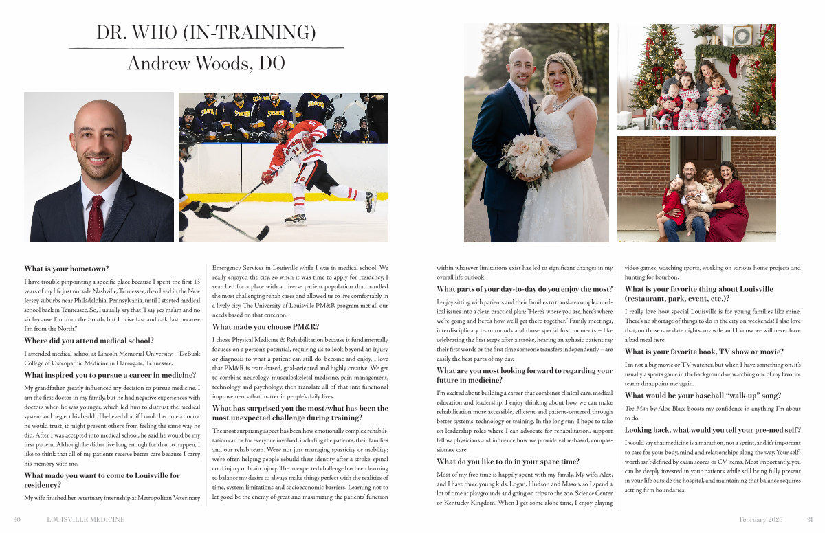 Emergency Services in Louisville while I was in medical school. We really enjoyed the city, so when it was time to apply for residency, I searched for a place with a diverse patient population that handled the most challenging rehab cases and allowed us to live comfortably in a lively city. The University of Louisville PM & R program met all our needs based on that criterion.