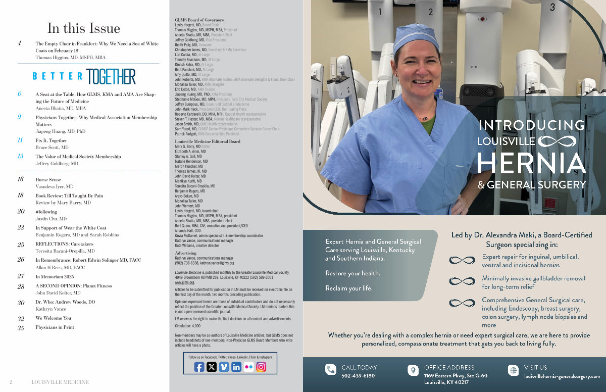Opinions expressed herein are those of individual contributors and do not necessarily reflect the position of the Greater Louisville Medical Society. LM reminds readers this is not a peer reviewed scientific journal.
