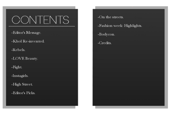 -Bodycon -Fashion week: Highlights. -Editor's Message. -Khol Re-invented. -Rebels. -LOVE Beauty. -Fight. -Instagirls. -High Street. -On the street