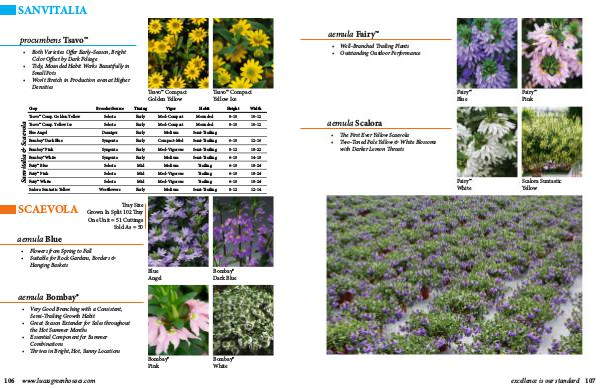 Crop Breeder / Source Timing Vigor Habit Height Width Tsavo™ Comp. Golden Yellow Selecta Early Med-Compact Mounded 8-10 10-12 Tsavo™ Comp. Yellow Ice Selecta Early Med-Compact Mounded 8-10 10-12 Blue Angel Danziger Early Medium Semi-Trailing