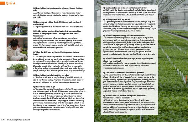 Q. How do I find out what varieties you offer? A. Your broker will have a complete listing of available varieties & sizes in our Rooted Cutting Programs. You can also obtain a copy of our variety listings on our website www. lucasgreenhouses. com.