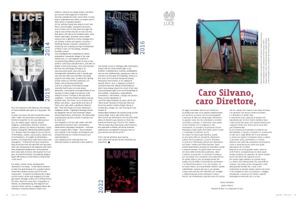 Paris the massacre of the Bataclan , the farewell to Franco Battiato who gave us a lay prayer : The cure . 60 years are many , and who knows how many other " titles " we could have remembered . Painful or beautiful . So it is also talking about Luce , its infinite pages , authors , graphic designers , collaborators , directors , research , polemics , debates ; hundreds of numbers , covers , articles crossing the history that walked parallel to it . Because even the pages of Luce are stories of friendships , clashes , and projects , studies and of confrontation , of insights of authoritative teachers , of entrepreneurs with great visions and courageous – if they had not been visionaries they would not have founded AIDI and two years later Luce . Of young and old engineers who came from established polytechnics , and architects who loved light , its value , the beauty that it can give , and the first Masters , the lighting designer figure affirmation and the Made in Italy known in the world . authors , certainly not always simple , but when you succeed that magazine or that book becomes valuable for both , since it tries in every way to understand each other , to explain and to listen what is mutually awaited . On the contrary , trying new ways to insert new forms , new thoughts , unexpected scenarios , such as when Luce in 2014 opens its pages not only to new authors but also to new columns that where not only in the measures laws , rules , lumen / watt ratios , technical canons while relevant , but a light that is other , protagonist in art , theater , cinema and squares , concerts , in buildings façades , museums , expression of modernity and contemporaneity , manifestation of what is new : our fascinating , dramatic , beautiful present . Luce investigates the complexity of culture , sustainable , humanistic design of the new millennium , is a seismograph capable of accommodating different points of view on the world in continuous transformation , and with its English to feel more Europe , more international . We have the advantage of living in an interconnected world , share the same unimaginable information until a decade ago , and Luce year after year identifies new skills , projects and creates jobs , in which the lighting culture values our territory , landscape , art , design and architecture potentials . Luce is an enterprise of innovative design creativity that focuses on social values , protection , conservation and regeneration of our country or nation , fragile but unique in the ability to recover . It shows us the way Piero Castiglioni - a Master of light as Vittorio Storaro , Pasquale Mari , Dan Flavin , Lucio Fontana , Bob Wilson and others - opening the first issue of Flaire , June 1989 , with a significant editorial title : " Not only measure but also illuminate ". Castiglioni writes : " Lighting technology should be integrated into an environmental culture , interpreting history , architecture , the philosophy underlying the spaces in which to operate and to make live ". Luce magazine in its ten-year paths , and with extraordinary directors then , authoritative collaborators and graphic designers - and how not to mention Mario Piazza - has monitored and collected in its changes , technological and cultural ferments as a result of research and experimentation . Luce , between pride and prejudice , has educated readers to understand new aesthetic and design canons in dialogue with architecture , design and has made known light in art , theaters , entertainment , cinemas , photography even to non-professionals , opening our eyes on scenarios of new ways of inhabiting , of living in the name of shared well-being and beauty . Many years have passed , in an odyssey of projects told on Luce , a magazine resilient to environmental and cultural transformations , which have always placed the center of our way of perceiving the light as an act of knowledge of new realities . Competence , responsibility , commitment , information , courage and passion . These are the ingredients of Luce that today celebrates 60 years , which has ' illuminated ' decades of chronicles that over time have written culture of light history in architecture , design , art , city , focusing on new models of relationships between the human being and his surroundings . And so will others after us . And even today , still present , the one who wrote when at that time was director on that now historical number 294 of Luce to ' his ' readers : " We are aware that these goals , which show us the right path to follow , cannot be achieved without your commitment and your trust : in your absence we will not go far ".