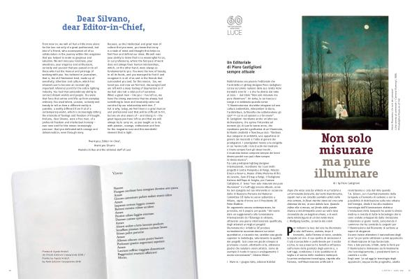 Because , as the intellectual and great man of culture that you were , you knew that irony is a state of mind and thought that helps us feel freer and defend our ideas . We will miss your ability to listen that is so meaningful for us , in our professions , where the fast pace of work does not always favor human relationships , which , on the other hand , were always so fundamental to you . You were the love of beauty , in all its facets , and you managed to find it and recognize it in all of us and in the friends that surrounded you and , for this reason , too , we loved you and now we feel lost , discouraged and are left with a deep feeling of deprivation as if we had also lost a vital part of ourselves . When a great man - like you – has left us , we have the strong awareness that we always had something to learn and invariably came out enriched by our relationship with him . T hat is why , today , we feel there is a great human and professional void that will be difficult to fill , but we are also aware of - and strong in - the great legacy you have left us and that we will always try to carry on , as you taught us to do , with passion , courage , enthusiasm and love for the magazine Luce and this wonderful element that is light .