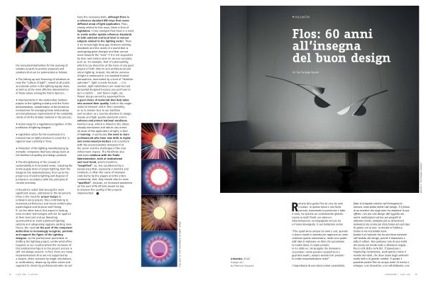 It should be noted that among the most significant issues , addressed in the document , there is the need for proper design to underpin every project , thus contributing to improved performance and visual comfort plus psychological and physical well-being . If , on the other hand , this aspect is lacking , even modern technologies will not be applied at their best and end up thwarting opportunities to build optimised lighting systems and adequately upgrade existing ones . Hence , the need on the part of the competent Authorities to increasingly recognize , promote and support the figure of the Lighting designer , as the professional specialized in drafting the lighting project , unlike what often happens in our country where the inclusion of this professional figure in the project process is still not always present . In fact , there are many implementations that are not supported by a project , often replaced by rough calculations , or verifications , drawn up by other actors and supplied to clients by professionals who do not have the necessary skills , although there is a reference standard UNI 11630 that covers different areas of light application . Thus , closely related to this issue , there is that of legislation . It has emerged that there is a need to create and / or update reference standards at both national and local level in various subjects related to the lighting sector . There is an increasingly deep gap between existing standards and the needs of a world that is undergoing great changes and that cannot move towards the “ new ” if it is not supported by clear and certain rules on various concepts ; such as , for example , that of sustainability , which today should be at the basis of any good project of both interior and architectural and urban lighting . Instead , the whole universe of light is immersed in a somewhat blurred atmosphere , dominated by a kind of “ fatalistic optimism ”: light is made because ... it is needed , light installations are made but not ( properly ) designed because you just have to turn a switch ... and there is light , etc . Proper design cannot be separated from a good choice of materials that duly takes into account their quality , both in the single material element and in their assembly , so as to remain true to our tradition and vocation as a country attentive to design , beauty and high quality standards and to enhance and protect national excellence . Another issue , which is linked to the others already mentioned and which cuts across all areas of the application of light , is that of training : in particular , the need to train professionals who have new skills in digital and environmental matters and consistent with the unprecedented demands that the sector and the challenges of the new millennium impose . The Manifesto also addresses relations with the Public Administration , both at institutional and local levels , which should be “ simplified ”: so , less conditioned by a bureaucracy that , especially in tenders and contracts , is often the cause of improper costs borne by the players and the entire community . And , they should also be more “ qualified ”, because , an increased awareness on the part of PA officials would be key to improve the quality of the projects implemented . mp , sun ra . the manifesto of light , 2022