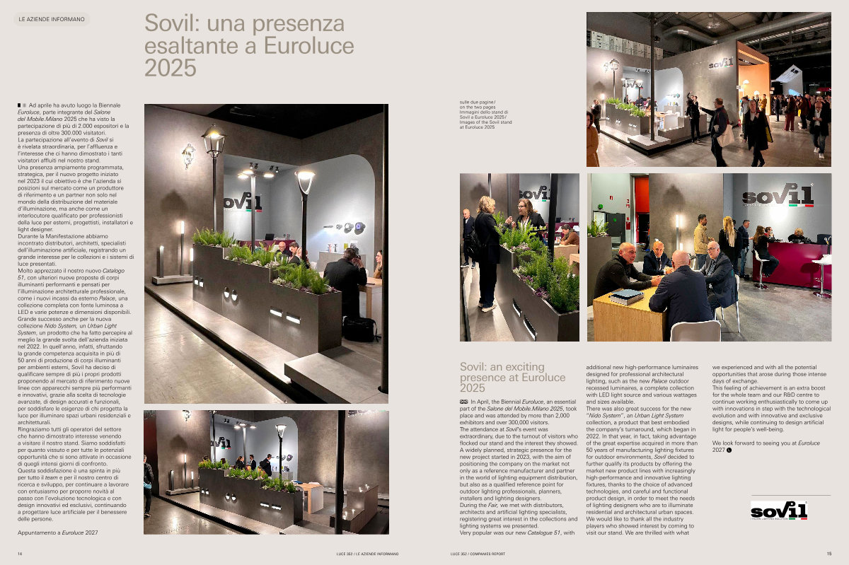 sulle due pagine / on the two pages Immagini dello stand di Sovil a Euroluce 2025 / Images of the Sovil stand at Euroluce 2025