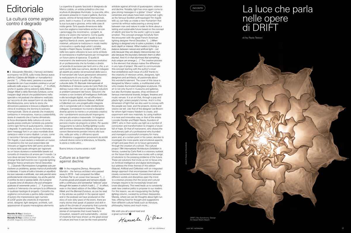 antidote against all kinds of qualunquism, violence and decline. Notably, light has once again come to give strong messages in a global“ chaos” where certainties and values have been overturned. Light, as the famous Scottish anthropologist Tim Ingold tells us, can help us create a new Humanism that cannot do without rediscovering a strong bond between man and nature in order to think about a lasting and sustainable future based on the concept of rebirth and love for the world. Light is to seek emotion. This concept emerges forcefully from the encounter with the great French American lighting designer Hervé Descottes“[…] When lighting is designed only to solve a problem, it often lacks depth or interest. What matters is finding a balance between natural and artificial light – not only because they are deeply interconnected, but also because the boundary between them is often blurred. And it’ s in that blurriness that something truly unique can emerge […]“ The creative process is the element that always makes the difference in any type of project. We want to communicate this concept starting with the author’ s cover that embellishes each issue of LUCE thanks to the creativity of reknown artists, designers, light designers and architects, all passionate about this wonderful element. The cover of this issue is designed by Marco Lodola, a multifaceted artist who creates illuminated plexiglass sculptures. His art is not only found in museums and galleries, but also illuminates squares, shop windows of famous international brands, bridges, theatres and music venues. It is an art that, through a pop and playful light, enters people’ s homes. And it is this dimension of light that we also want to convey with the people we meet, and the projects, stories and visions we tell. Like that of the designer Lee Broom for whom light means freedom to create, and experiment with new materials, by using tradition in a new and innovative way, or that of the artists Lonneke Gordijn and Ralph Nauta, founders of DRIFT, who in their works use light as a symbol of connection and transformation to imagine a future full of hope. Or that of marionanni, who shows the evolutionary path of a professional who founded and managed a successful company for many years and, at a certain point in his career, decides to investigate the more poetic and emotional aspects of light and pass them on to future generations through the creation of a school. The cultural project 19th International Architecture Exhibition in Venice, curated by Carlo Ratti is a visionary outlook on the future that outlines new routes with a range of solutions to the pressing problems of the future. These are solutions that invite us not to focus only on Artificial Intelligence and digital technologies, but address the three themes of this edition( Natural, Artificial and Collective) with an integrated design approach that encompasses them all in a closely connected manner. Connections between different worlds and disciplines open the mind to a creative process that the social and cultural changes require to be increasingly broad and cross-disciplinary. This need leads us to constantly seek new creative paths to propose to our readers. For this reason, we are inaugurating the Surfing lighting column, curated by architect Alessandro Marata, where we can let thoughts about light run free, offering food for thought and suggestions from different cultural fields such as literature, philosophy, history and much more...