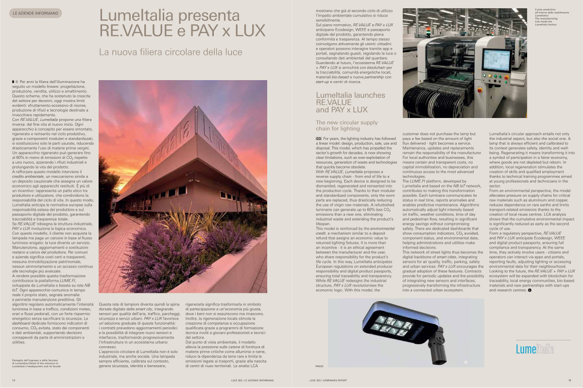 ����������������������������������������� seguito un modello lineare: progettazione, produzione, vendita, utilizzo e smaltimento. Questo schema, che ha sostenuto la crescita del settore per decenni, oggi mostra limiti evidenti: sfruttamento eccessivo di risorse, ���������������������������������������������� invecchiare rapidamente. Con RE. VALUE, LumeItalia�������������������� �������������������������������������������� apparecchio è concepito per essere smontato, rigenerato e reinserito nel ciclo produttivo, grazie a componenti modulari e standardizzati, si sostituiscono solo le parti usurate, riducendo drasticamente l’ uso di materie prime vergini. ������������������������������������������� �������������������������������������������� ���������������������������������������������� prolungando la vita del prodotto. ����������������������������������������� credito ambientale, un meccanismo simile a un deposito cauzionale che assegna un valore economico agli apparecchi restituiti. È più di un incentivo: rappresenta un patto etico tra produttore e utilizzatore, che condividono la responsabilità del ciclo di vita. In questo modo, LumeItalia anticipa le normative europee sulla responsabilità estesa del produttore e sul passaporto digitale del prodotto, garantendo tracciabilità e trasparenza totale. Se RE. VALUE ridisegna la struttura industriale, PAY x LUX rivoluziona la logica economica. Con questo modello, il cliente non acquista la ������������������������������������������� luminoso erogato: la luce diventa un servizio. ������������������������������������������� restano a carico del produttore. Per comuni ���������������������������������������������� nessuna immobilizzazione patrimoniale, nessun ammortamento e un accesso continuo alle tecnologie più avanzate. A rendere possibile questa trasformazione contribuisce la piattaforma LUME. FI, sviluppata da LumeItalia e basata su rete NB IoT. Ogni apparecchio comunica in tempo reale il proprio stato, segnala anomalie e permette manutenzione predittiva. Gli algoritmi regolano automaticamente l’ intensità ��������������������������������������������� ����������������������������������������������� ��������������������������������������������� dashboard dedicate forniscono indicatori di ������������������������������������������� e dati ambientali, supportando decisioni consapevoli da parte di amministrazioni e utilities.