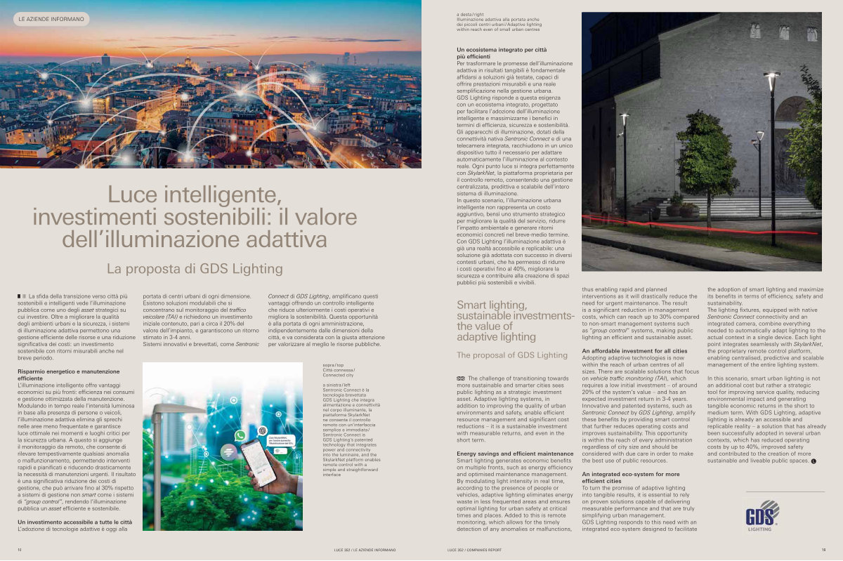 Connect di GDS Lighting�������������������� ������������������������������������������� che riduce ulteriormente i costi operativi e migliora la sostenibilità. Questa opportunità è alla portata di ogni amministrazione, indipendentemente dalle dimensioni della città, e va considerata con la giusta attenzione per valorizzare al meglio le risorse pubbliche.
