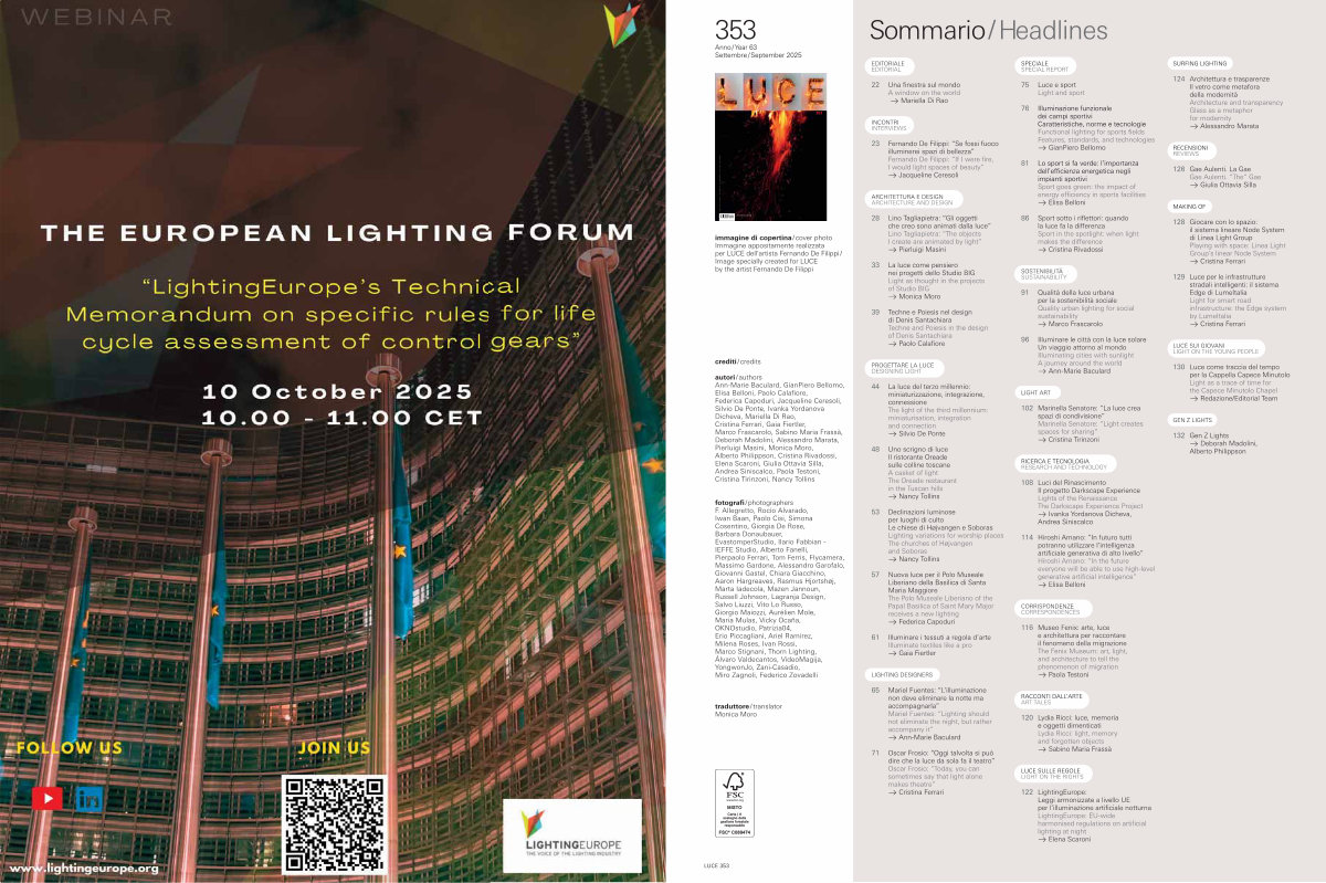 Poste Italiane spa – Sped. in A. P. – D. L. 353 / 2003( conv. in L. 27.02.2004 n ° 46) art. 1, comma 1, LO / MI – ISSN 1828-0560 immagine di copertina / cover photo ���������������������������������� per LUCE dell ' artista Fernando De Filippi / Image specially created for LUCE by the artist Fernando De Filippi