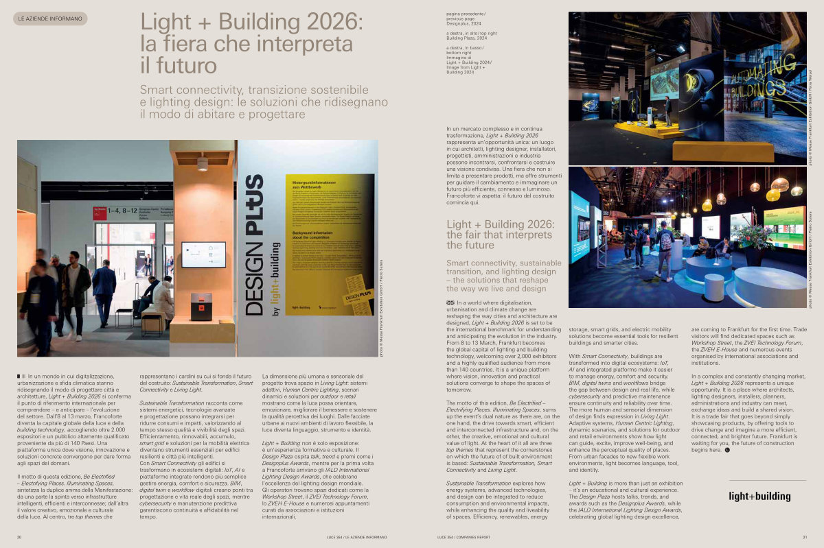 In un mondo in cui digitalizzazione, ��������������������������������������� ridisegnando il modo di progettare città e architetture, Light + Building 2026 si conferma il punto di riferimento internazionale per comprendere – e anticipare – l’ evoluzione del settore. Dall’ 8 al 13 marzo, Francoforte diventa la capitale globale della luce e della building technology, accogliendo oltre 2.000 ���������������������������������������������� proveniente da più di 140 Paesi. Una piattaforma unica dove visione, innovazione e soluzioni concrete convergono per dare forma agli spazi del domani.
