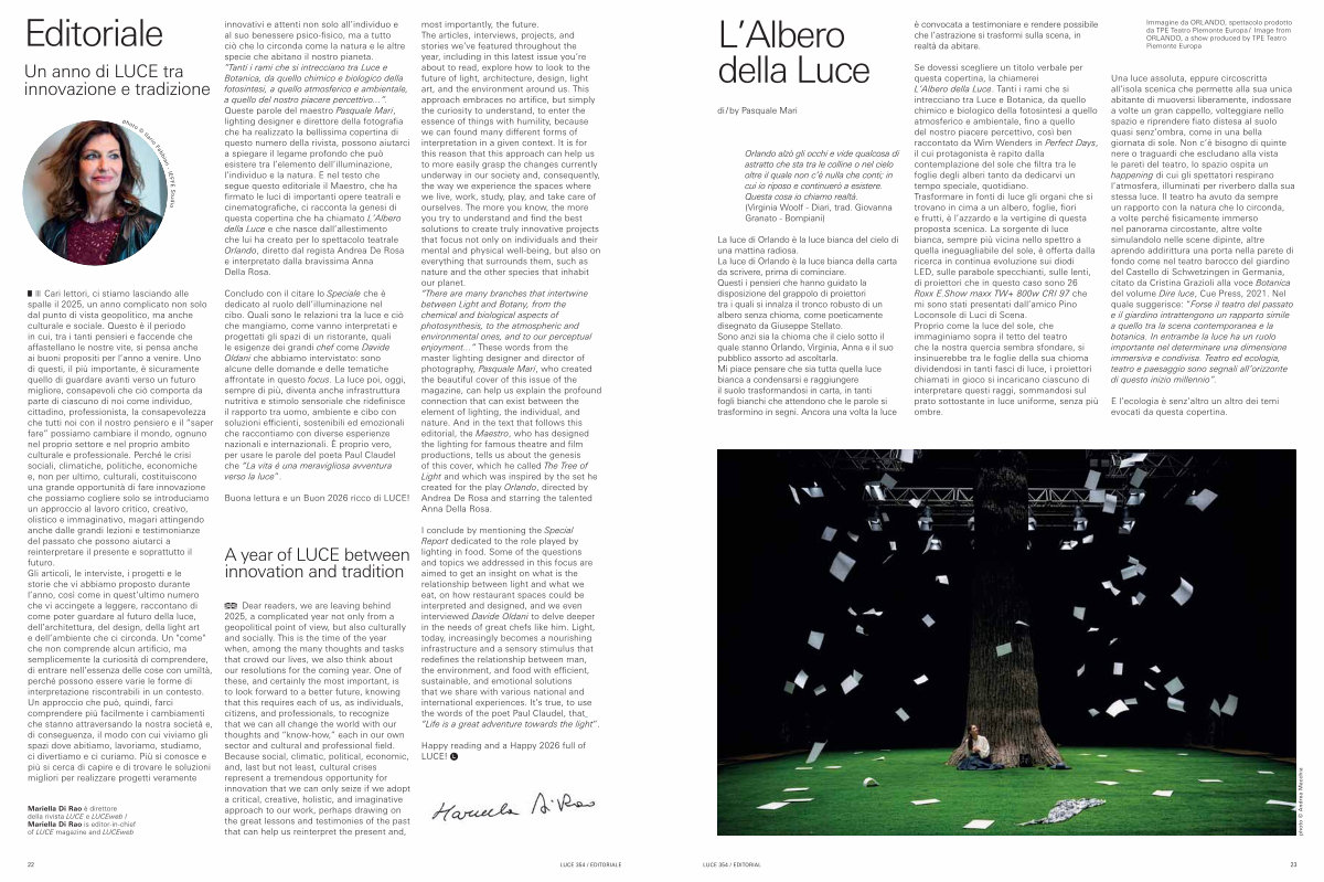 Se dovessi scegliere un titolo verbale per questa copertina, la chiamerei L’ Albero della Luce. Tanti i rami che si ������������������������������������������� chimico e biologico della fotosintesi a quello �������������������������������������� del nostro piacere percettivo, così ben �����������������������������Perfect Days, il cui protagonista è rapito dalla ����������������������������������������� foglie degli alberi tanto da dedicarvi un tempo speciale, quotidiano. Trasformare in fonti di luce gli organi che si ����������������������������������������� e frutti, è l’ azzardo e la vertigine di questa proposta scenica. La sorgente di luce bianca, sempre più vicina nello spettro a ����������������������������������������������� ricerca in continua evoluzione sui diodi LED, sulle parabole specchianti, sulle lenti, di proiettori che in questo caso sono 26 Roxx E. Show maxx TW + 800w CRI 97 che mi sono stati presentati dall’ amico Pino Loconsole di Luci di Scena. Proprio come la luce del sole, che immaginiamo sopra il tetto del teatro che la nostra quercia sembra sfondare, si insinuerebbe tra le foglie della sua chioma dividendosi in tanti fasci di luce, i proiettori chiamati in gioco si incaricano ciascuno di interpretare questi raggi, sommandosi sul prato sottostante in luce uniforme, senza più ombre.
