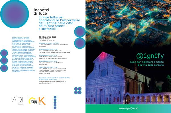 L ’ illuminazione e le nuove tecnologie hanno un ruolo fondamentale nel processo di rigenerazione e di trasformazione delle città . Un processo che vede coinvolti diversi attori e protagonisti in dialogo per creare strategie efficaci al fine di rendere le aree urbane sempre più smart ed ecosostenibili . Durante i cinque talks organizzati da AIDI ( Associazione Italiana di Illuminazione ) in collaborazione con Key Energy , che si svolgeranno nell ’ area Città Sostenibile della Fiera K . EY dal 22 al 24 marzo a Rimini , professionisti , esperti , aziende , utility e rappresentanti delle PA si confronteranno e porteranno la loro esperienza al fine di fare chiarezza sullo stato di fatto e sul futuro di una luce sempre più intelligente , interattiva e sostenibile .