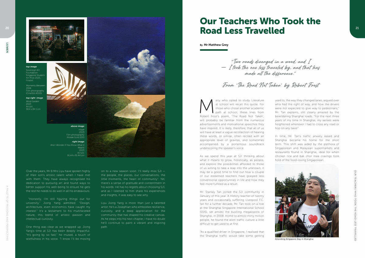 Mr. Stanley Tan joined the SJI community in January of this year. A History teacher of twenty years and occasionally suffering Liverpool F. C. fan for a further decade, Mr. Tan took on a role at the Shanghai Singapore International School( SSIS), set amidst the bustling megalopolis of Shanghai, in 2008. Home to almost thirty million people, he found the alien traffic culture a little difficult to get used to at first.
