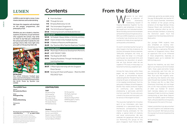Beyond the headlines, we also shed light on our tenacious SJI Girls Football Team, those green-and-white hoops you occasionally spot from afar on blazingly hot 38 degree days on the field. You’ ll also find insightful writeups featuring new teachers who have taken the path less travelled: Mr Stanley Tan( History) and Ms Liu Wan Zhen( Chemistry). And finally, let’ s not forget one of the most pulsating moments of 2025: our Football“ A” division team narrowly edging out a plucky Nanyang JC team to clinch our maiden championship at Jalan Besar Stadium! Kieran Tan( LE609), captain of the Boys’ Team, who provided the winning assist, fittingly graces the cover of this issue.