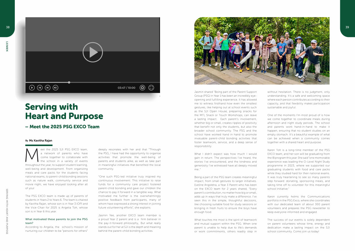 Jasmin shared“ Being part of the Parent Support Group( PSG) in Year 1 has been an incredibly eyeopening and fulfilling experience. It has allowed me to witness firsthand how even the smallest gestures, like helping out at school events such as the SJI Open House, preparing snacks for the MTL Snack or Touch Workshops, can leave a lasting impact. Each parent’ s involvement, whether big or small, creates ripples of positivity that benefit not only the students, but also the broader school community. The PSG and the school have worked hand in hand to promote invaluable parent-child bonding activities that foster teamwork, service, and a deep sense of responsibility.