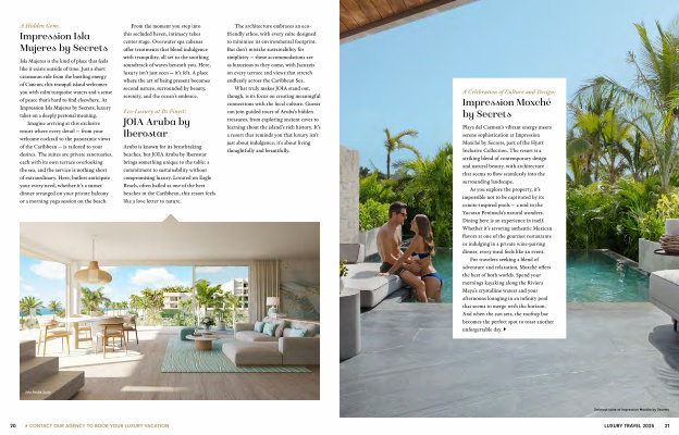 What truly makes JOIA stand out , though , is its focus on creating meaningful connections with the local culture . Guests can join guided tours of Aruba ’ s hidden treasures , from exploring ancient caves to learning about the island ’ s rich history . It ’ s a resort that reminds you that luxury isn ’ t just about indulgence ; it ’ s about living thoughtfully and beautifully .