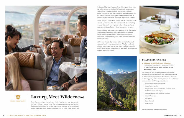 In GoldLeaf Service , the upper level of the glass-dome train car offers sprawling windows for breathtaking panoramic views of the Canadian Rockies . Downstairs , an elegant dining room invites you to enjoy freshly prepared meals , from gourmet breakfasts to indulgent three-course lunches , all while dramatic landscapes unfold just beyond the windows .