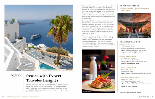 Whether you have eight or 48 hours in port , these exclusive editor ’ s tips and insights will help you make the most of every minute , learning how to dine at Asia ’ s best restaurants , where to stray from the beaten path in the Greek isles and the most beautiful libraries in Rio de Janeiro . It ’ s a match made in travel heaven — taking you to the most compelling places on Earth with recommendations from the people who know them best .