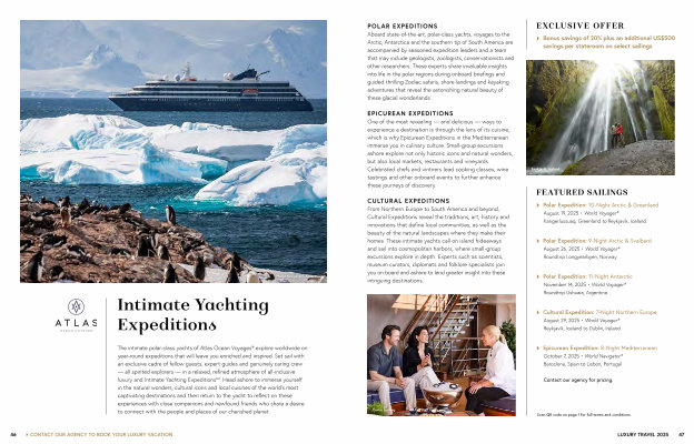The intimate polar-class yachts of Atlas Ocean Voyages ® explore worldwide on year-round expeditions that will leave you enriched and inspired . Set sail with an exclusive cadre of fellow guests , expert guides and genuinely caring crew — all spirited explorers — in a relaxed , refined atmosphere of all-inclusive luxury and Intimate Yachting Expeditions™ . Head ashore to immerse yourself in the natural wonders , cultural icons and local cuisines of the world ’ s most captivating destinations and then return to the yacht to reflect on these experiences with close companions and newfound friends who share a desire to connect with the people and places of our cherished planet .