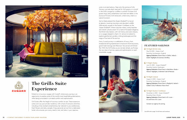 Every Cunard journey is a celebration of luxury , from exceptional dining experiences to exclusive shore excursions , grand Gala Evenings and Afternoon Tea served with British flair . With the Grill Suites as your private retreat , you ’ ll enjoy the very best of service , space and sophistication on each remarkable voyage .