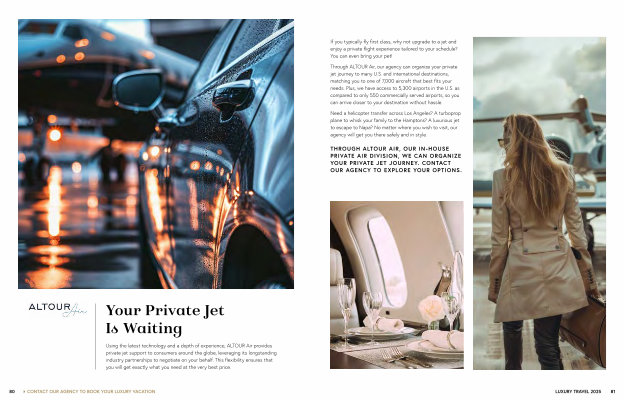 THROUGH ALTOUR AIR , OUR IN-HOUSE PRIVATE AIR DIVISION , WE CAN ORGANIZE YOUR PRIVATE JET JOURNEY . CONTACT OUR AGENCY TO EXPLORE YOUR OPTIONS .