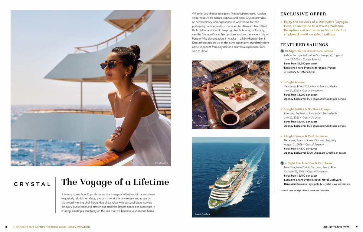 It is easy to see how Crystal creates the voyage of a lifetime. On board these exquisitely refurbished ships, you can dine at the only restaurant at sea by the award-winning chef, Nobu Matsuhisa, relax with personal butler service for every guest room and stretch out amid the largest space per passenger in cruising, creating a sanctuary on the sea that will become your second home.