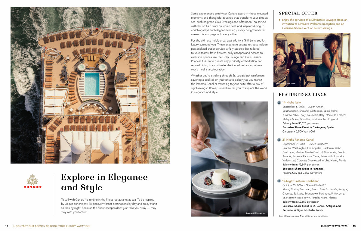 To sail with Cunard ® is to dine in the finest restaurants at sea. To be inspired by unique enrichment. To discover vibrant destinations by day and enjoy starlit soirées by night. Because the finest escapes don’ t just take you away— they stay with you forever.