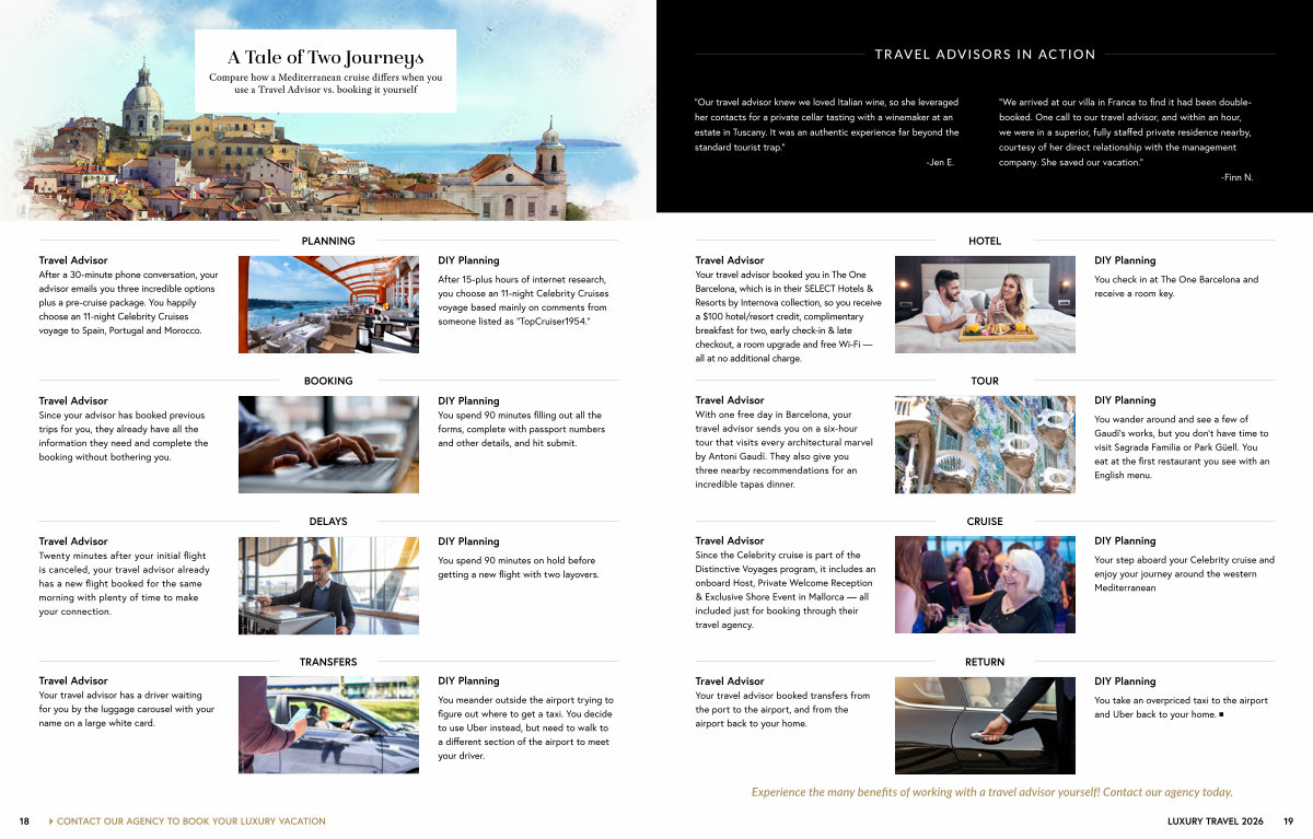 Travel Advisor After a 30-minute phone conversation, your advisor emails you three incredible options plus a pre-cruise package. You happily choose an 11-night Celebrity Cruises voyage to Spain, Portugal and Morocco.