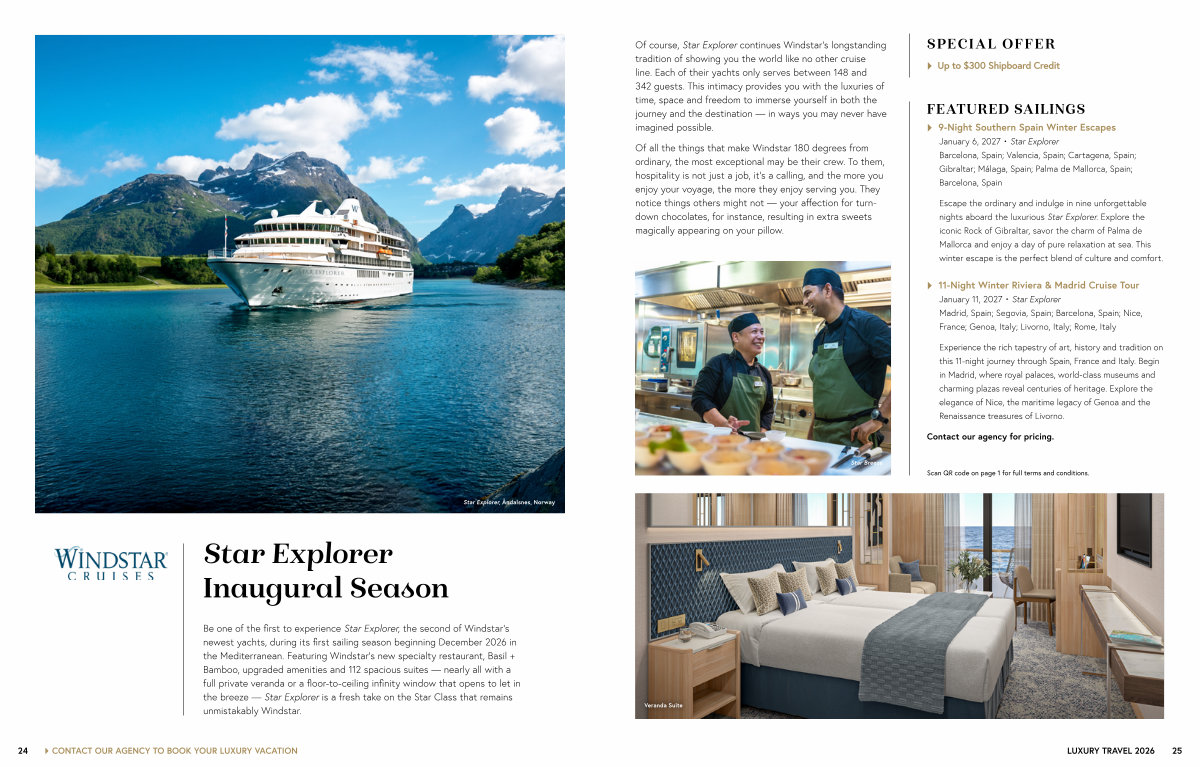 Of course, Star Explorer continues Windstar’ s longstanding tradition of showing you the world like no other cruise line. Each of their yachts only serves between 148 and 342 guests. This intimacy provides you with the luxuries of time, space and freedom to immerse yourself in both the journey and the destination— in ways you may never have imagined possible.