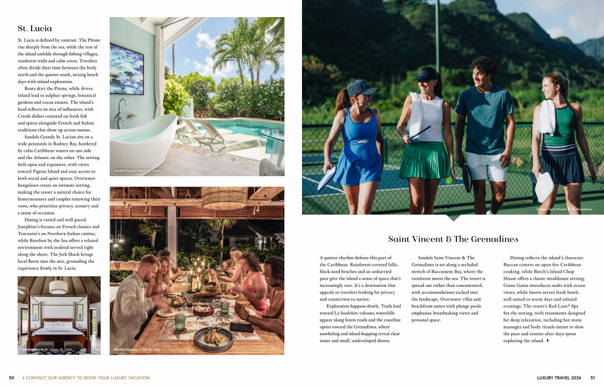 Sandals Saint Vincent & The Grenadines is set along a secluded stretch of Buccament Bay, where the rainforest meets the sea. The resort is spread out rather than concentrated, with accommodations tucked into the landscape. Overwater villas and beachfront suites with plunge pools emphasize breathtaking views and personal space.