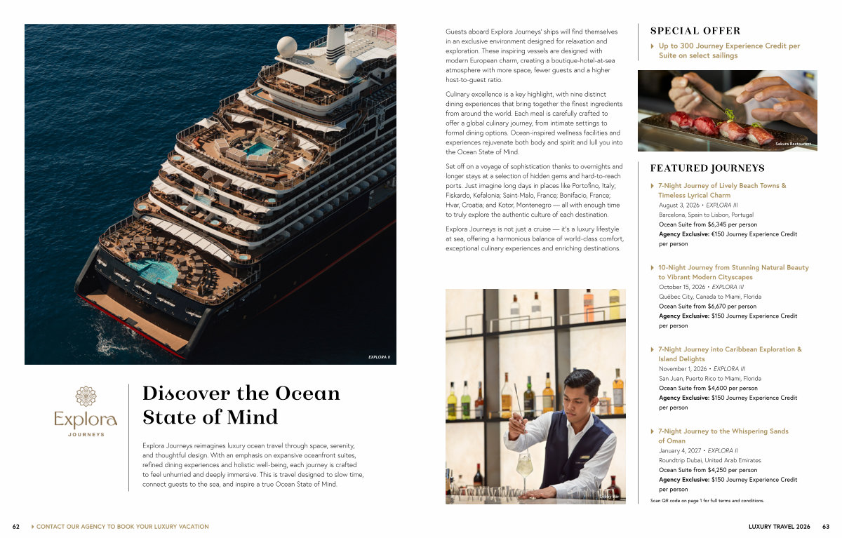 Explora Journeys reimagines luxury ocean travel through space, serenity, and thoughtful design. With an emphasis on expansive oceanfront suites, refined dining experiences and holistic well-being, each journey is crafted to feel unhurried and deeply immersive. This is travel designed to slow time, connect guests to the sea, and inspire a true Ocean State of Mind.