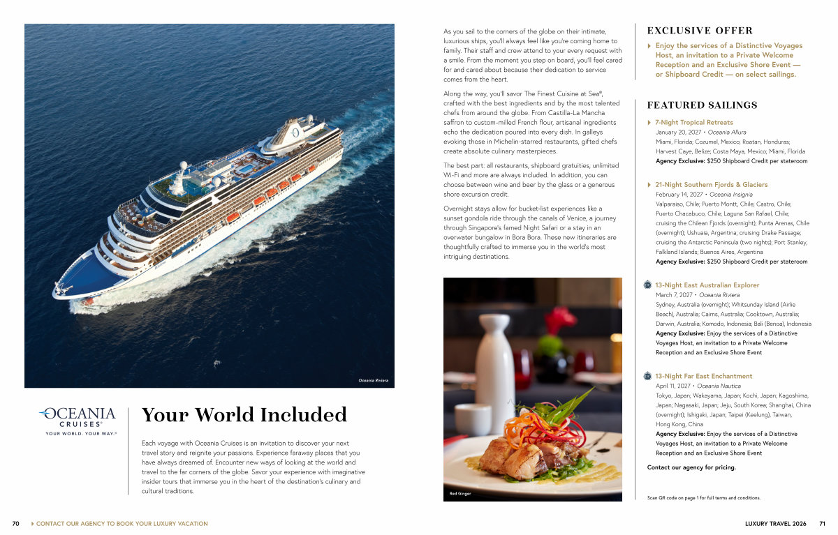 � 7-Night Tropical Retreats January 20, 2027 • Oceania Allura Miami, Florida; Cozumel, Mexico; Roatan, Honduras; Harvest Caye, Belize; Costa Maya, Mexico; Miami, Florida Agency Exclusive: $ 250 Shipboard Credit per stateroom
