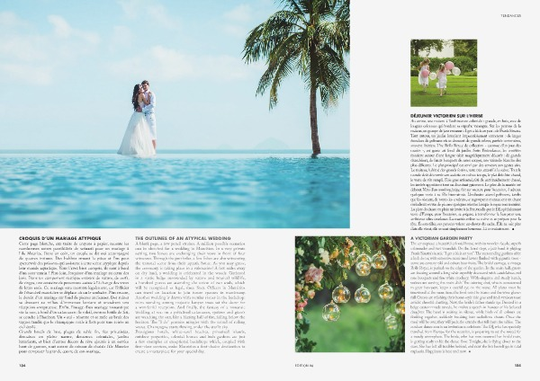 A VICTORIAN GARDEN PARTY The centrepiece: a beautiful colonial house, with its wooden facade, superb colonnades and vast verandah. On the front steps, a jazz band is playing Frank Sinatra ' s iconic " I get a kick on you ". The surrounding gardens offer a lush decor, with extensive manicured lawns flanked with gigantic trees- some are century-old and others bear fruits. The bridal carriage, a vintage Rolls Royce, is parked on the edge of the garden. In the main hall, guests are feasting around a long table superbly decorated with candelabras, red rose bouquets and fine white crockery. With elegance and steady hands, waiters are serving the main dish. The catering chef, who is accustomed to great banquets, keeps a careful eye on the scene. All plates must be uncovered at the same time, the food must be warm and the wine glasses full. Guests are relishing their home-style foie gras and fresh venison roast amidst cheerful chatting. Now, the bride ' s father stands up. Dressed in a beige custom-made tuxedo, he makes a speech in honour of his beloved daughter. The band is waiting in silence, while birds of all colours are flocking together, suddenly breaking into melodious chants. Once the meal will be over, they will peck the crumbs that fell from the tables. The outdoor dance area is an invitation to celebrate. The DJ, who has specially travelled from Europe for the occasion, is preparing to set the mood for a trendy atmosphere. The bride, who has now removed her bridal train, is getting ready to hit the dance floor. Tonight, she is flying closer to the stars. She has left all troubles behind, and now she lets herself go in total euphoria. Happiness is here and now.